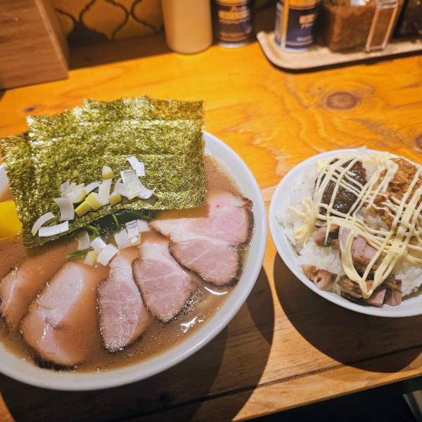 千葉県北松戸に本店を構える人気店の3号店。飯が進むラーメン、として、濃厚なスープにもちもちとした太麺、トッピングには玉葱といためた豚の生姜焼き。生卵の黄身にニンニク、ナルト、青ネギ。これこそがっつり麺と言わんばかりのボリューム。ラーメン注文で、ごはん無料。